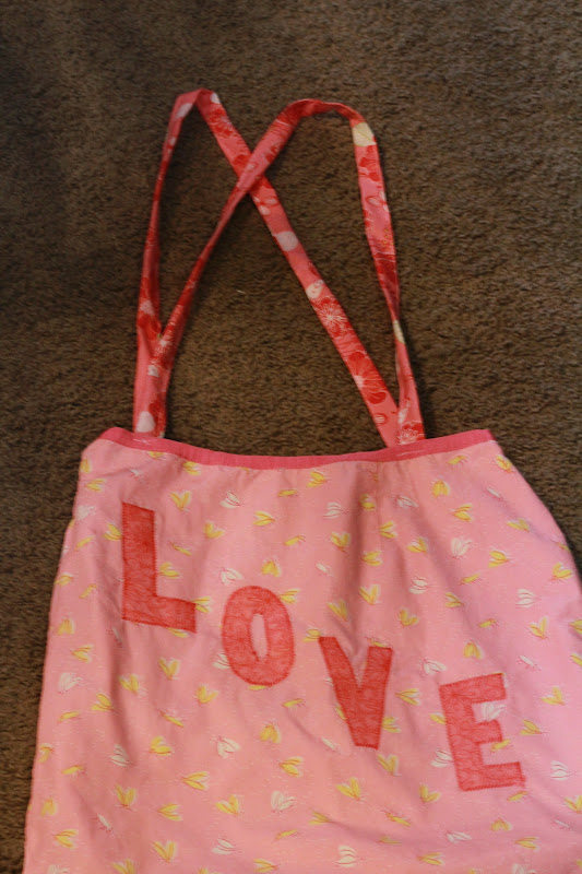 So anywho I am all about repurposing old clothes that I dont wear (or quite frankly don't fit) into other items or just learning to sew projects. I love the idea of reversible things and this skirt was reversible so I thought maybe a reversible bag? And while I am on the topic of reversible! Let me remind everyone, because apparently I can NEVER seem to remember myself: if you want to applique (i.e. my LOVE motif on skirt) something, you must do it before you put product together, I cannot tell you how many times ( well, actually 4) I have made a reversible bib and then realized that if I put a decoration on one side the seams would go through and "ruin" the other side. This is not a part of sewing that requires skill,...just some remembering and planning. Not my best qualities!!! Anyway, I figured I could save the top finished seam ( I am ALL about that as I find finishing tiny seams and bias tape a bit tedious) and perhaps just sew the bottoms together for a nice carry-all?